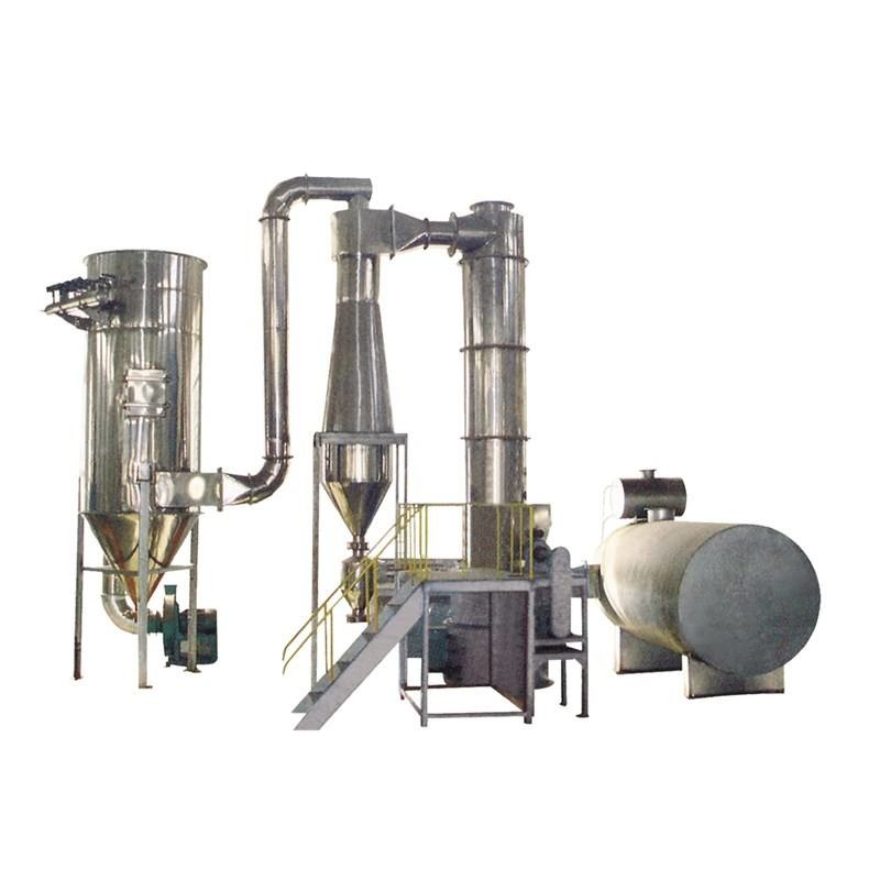 อากาศถูกทำให้ร้อนถึงประมาณ 180-300 ° C ผ่านฮีตเตอร์และเข้าสู่แฟลชไดร์เป่าแบบหมุนวัสดุเปียกจะถูกป้อนเข้าไปในกลไกการป้อนด้วยสกรูโดยอุปกรณ์ลำเลียง และสามารถควบคุมตัวป้อนสกรูแบบไม่มีขั้นตอนได้หลังจากรีดแล้ว วัสดุจะถูกดันเข้าไปในหอคอยหลัก จากนั้นใบมีดจะถูกบดด้วยความเร็วสูงและมีมุมที่แตกต่างกันกระแสลมที่อุณหภูมิสูงเข้าสู่หอคอยหลักด้วยความเร็วสูงส่งผลกระทบต่อการหมุนด้วยความเร็วสูงและการขึ้นรถไฟในเวลานี้ อุณหภูมิของกระแสลมจะลดลงอย่างรวดเร็ว และความชื้นของวัสดุจะระเหยอย่างรวดเร็วจึงเสร็จสิ้นกระบวนการอบแห้ง